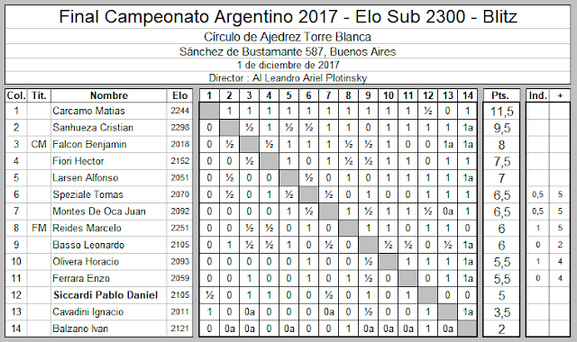 Luego de su actuación en el Blitz, Pablo Daniel Siccardi intervino en la Semifinal del Campeonato Argentino 2300 (12’+3″), donde se ubicó en la 24ª colocación entre 69 inscriptos, entre ellos 22 titulados, de los cuales 4 eran GMI y 10 MI. Nuestro jugador obtuvo 5 puntos fruto de 5 victorias y 4 derrotas, una de ellas frente al vencedor, el GMI Leandro Krysa. Este obtuvo 7 unidades y fue secundado por seis maestros a medio punto : Slipak, Fiorito, Hoffman, Dolezal, Benedetti, Filgueira y la sorpresa, Andrés Zamani.