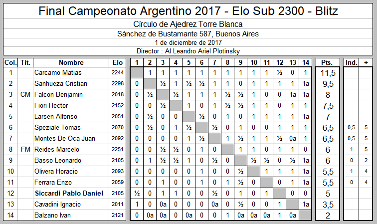 Pablo Siccardi finalizó en la novena posición de la final del Campeonato Argentino Rápido (12’+3″) Sub 2300 disputado en la tarde del domingo ppdo. en el Círculo de Ajedrez Torre Blanca de Buenos Aires.