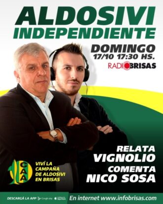 Domingo 17 de octubre, desde el Estadio José María Minella, a partir de las 17.30 horas, por Radio Brisas, Aldosivi-Independiente. Relata Eduardo Vignolio, comenta Nico Sosa.