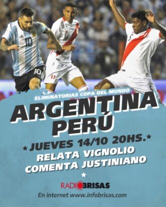 Jueves 14 de octubre a las 20.00 horas, por Radio Brisas eliminatorias sudamericanas de fútbol, Argentina-Perú. Relata Eduardo Vignolio, comenta Justiniano.