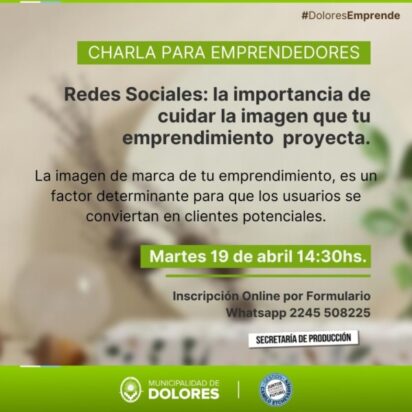 La Municipalidad de Dolores por medio de la Secretaría de Producción, invita a la charla para emprendedores y público en general: “Redes Sociales; la importancia de cuidar la imagen que tu emprendimiento proyecta”, a realizarse el martes 19 de abril a las 14.30 horas en el Salón Blanco Municipal, a cargo del publicista Lucio Napolitano.