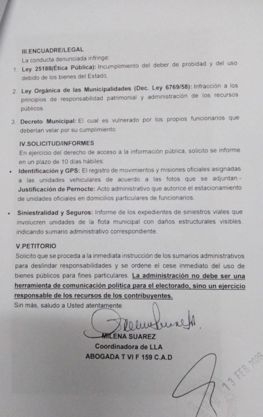 La coordinadora de La Libertad Avanza en Dolores, Milena Suárez, presentó una denuncia administrativa formal contra el intendente Juan Pablo García por el uso indebido de vehículos del patrimonio municipal para fines personales y políticos, financiados con el dinero de los contribuyentes.