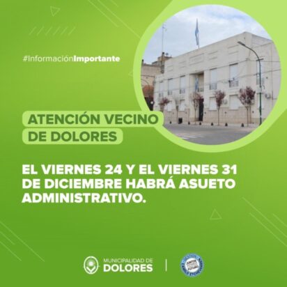 Desde la Municipalidad de Dolores se comunica que el 24 y 31 de diciembre por el asueto administrativo no habrá atención al público. Además, se informa que el jueves 23 de diciembre se atenderá hasta las 12.00 horas.