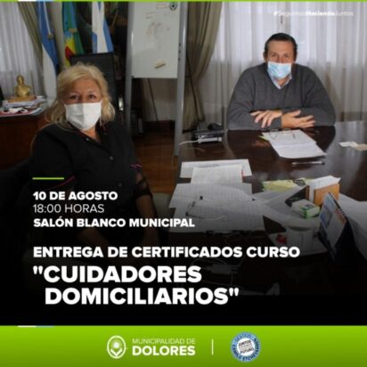 Hoy a las 18.00 horas en el Salón Blanco Municipal, el Intendente Camilo Etchevarren y la Secretaria de Salud Sandra Metz, harán entrega de los Certificados a los vecinos que realizaron el Curso de Cuidadores Domiciliarios.