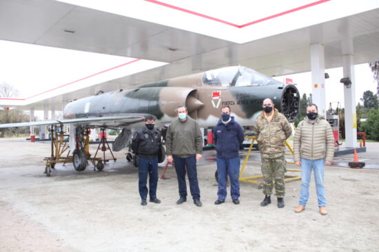 El Intendente Camilo Etchevarren, junto con el Secretario de Gobierno, Jorge Gisondo, recibieron el avión Mirage que llegó a Dolores y que será emplazado