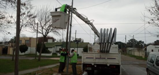Integrantes del Departamento de Electricidad Municipal colocó columnas e instaló luminarias LED en calle Brughetti entre Selva y Gatti.