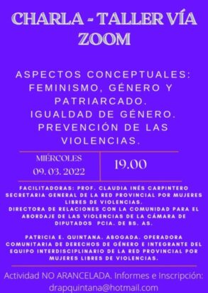 Desde la Red Provincial por Mujeres Libres de Violencias, con la participación de su Secretaria General, Prof. Claudia Inés Carpintero, (especializada en género e historia de las mujeres, docente de la UDE y UNLP, -Investigadora del Conicet-, Directora de relaciones con la comunidad para el abordaje de las violencias de la Honorable Cámara de Diputados de la Provincia de Buenos Aires) y Patricia Quintana, (abogada, criminóloga, diplomada en derechos humanos y género por la UNLP, derechos de las infancias por la UDE, integrante del equipo técnico de la Red), se dará comienzo a un ciclo de charlas, talleres y actividades destinadas a brindar conocimientos sobre cuestiones relacionadas al Feminismo, Género y Prevención de las Violencias.