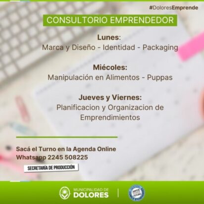 La Municipalidad de Dolores por medio de la Secretaría de Producción pone a disposición el “Consultorio Emprendedor”, en el mismo podes sacando un turno online tener mentorías individuales para acompañar el desarrollo de tu emprendimiento enfocado en diferentes áreas: