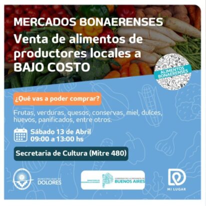 La Secretaria de Producción de la Municipalidad de Dolores informa que el sábado 13 de abril de 9.00 a 13.00 horas, en la Plaza 25 de Mayo, ubicada en calles Mitre y 25 de Mayo, se realizará por segunda vez “Mercados Bonaerenses”.