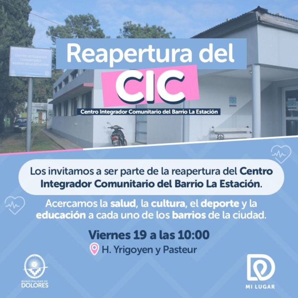 Este viernes 19 de abril a las 10:00hs se realizará la reapertura del Centro Integrador Comunitario del Barrio de La Estación, en Pasteur e Yrigoyen. Los esperamos.