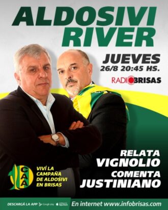 Jueves 26 de agosto, por Radio Brisas, a partir de las 20.45 horas, River-Aldosivi. Relata Eduardo Vignolio, comenta Justiniano.