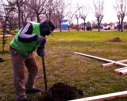 Personal de la Dirección de Espacios Verdes trabaja en la Plaza Soldado Dolorense, en la que se está construyendo una cerca perimetral para posteriormente instalar un rosedal, réplica del Cementerio de Darwin en las Islas Malvinas. Está previsto colocar 230 rosas.