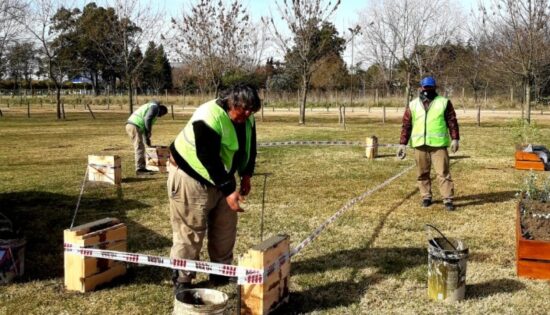 En el Paseo de la Guitarra, personal de la Dirección de Espacios Verdes, comenzó llenando moldes con hormigón para realizar una importante cantidad de bancos en lo que será el circuito aeróbico, área de gimnasios y laterales del lago. Las mismas tareas se continuarán en el Parque Libres del Sur y en otros espacios públicos.