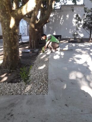 Se realizó la colocación de arbustos y piedras como terminación para luego efectuar el pintado de la plataforma de hormigón que se utilizará como lugar de memoria a los fallecidos por COVID-19 en el Cementerio. Los trabajos son realizados por integrantes de la Dirección de Espacios Verdes.