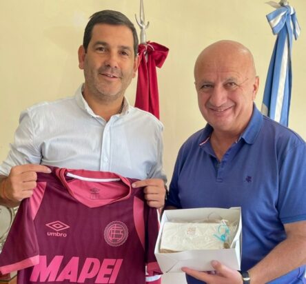 Durante el encuentro, intendente García recibió dos camisetas oficiales 2026 del Club Lanús, mientras que el Municipio de Dolores obsequió una Torta Argentina, el tradicional producto y emblema cultural que representa a nuestra ciudad.
